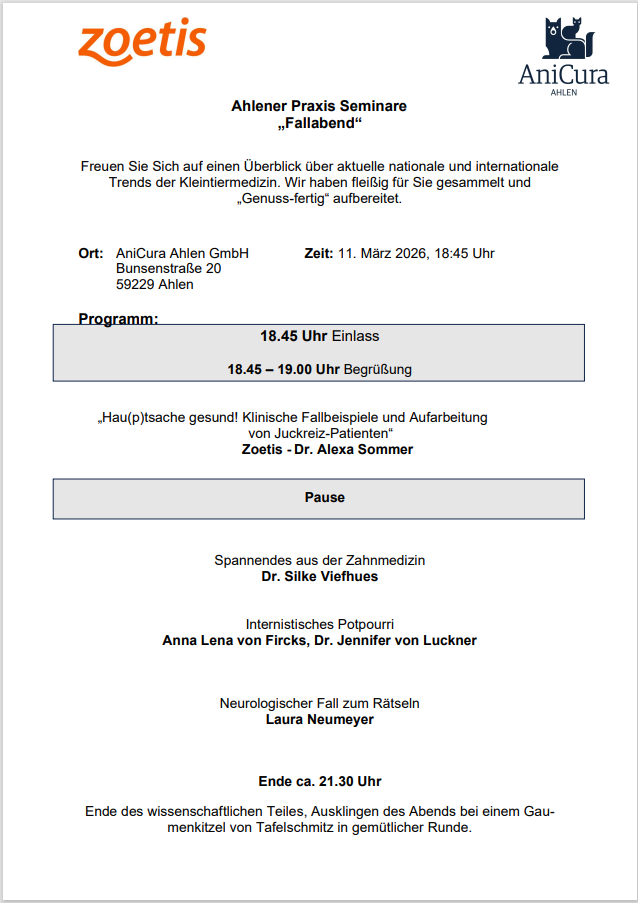 „Das vermittelte Wissen soll so vorgetragen werden, dass Tierärztinnen und Tierärzte es ohne Umschweife ihren Patienten zugutekommen lassen können. So können die Kolleginnen und Kollegen morgens noch Sprechstunde halten und abends wieder zu Hause sein und trotzdem Vorträge namhafter Referenten hören.“ – dies ist der Grundgedanke der Fortbildungsreihe.